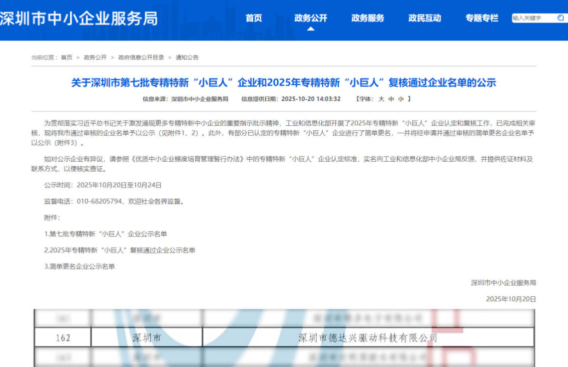近日,工业和信息化部正式公布了新一批国家级专精特新“小巨人”企业名单,深圳市德达兴驱动科技凭借在微特电机领域深厚的技术积累、卓越的创新能力和突出的市场地位,成功入选。这一国家级荣誉的获得,标志着公司在专业化、精细化、特色化、新颖化的发展道路上取得了里程碑式的成就,获得了国家层面的高度认可。