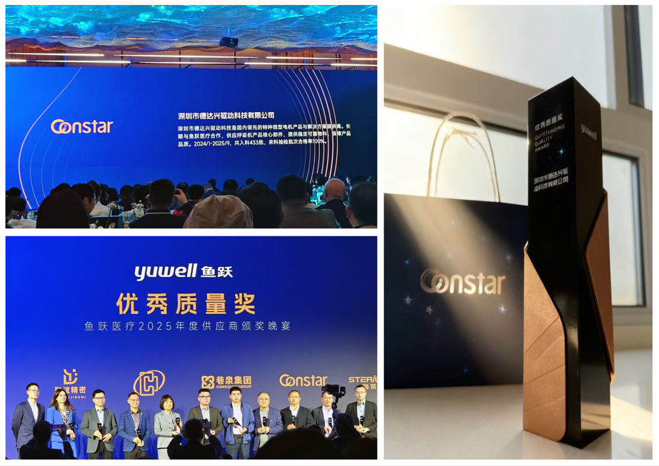 近日,国内医疗设备领军企业鱼跃医疗隆重召开了2025年度供应商大会。在本次大会上,我司—深圳德达兴驱动科技,凭借在呼吸机涡轮风机产品上卓越稳定的质量表现和“零缺陷”的交付承诺,从众多供应商中脱颖而出,荣膺大会颁发的 “质量优质奖” 。这一沉甸甸的荣誉,是客户对我们产品品质与服务的最高肯定,也是我们坚守“匠心精神”道路上的重要里程碑。